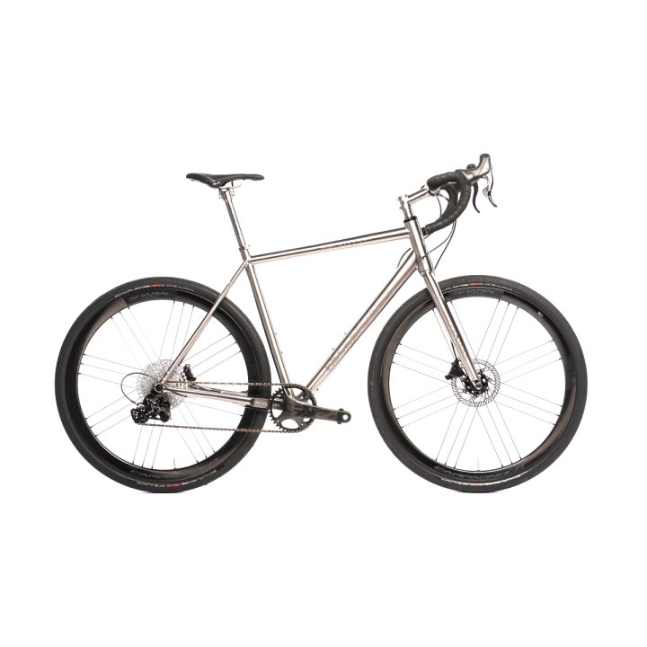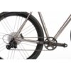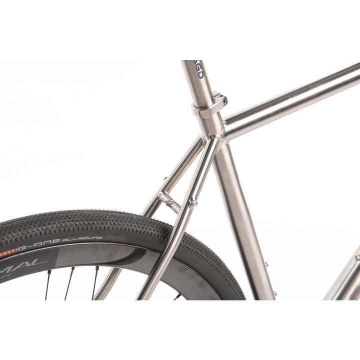 Le titane est le matériau idéal pour les vélos Gravel. Il est résistant aux rayures et à la saleté, à l’eau et au sel de déneigement. Le passage des pneus est suffisamment grand pour accueillir des pneus de 35 mm et des garde-boue.